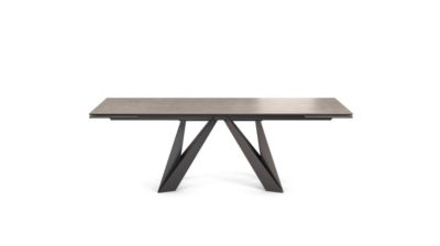 This dining table with a bold design features a ceramic tabletop on a glass slab, supported by a lacquered steel base. The eight steel plates, shaped like trapezoids, are paired together on the ground and unfold in a highly graphic movement to suppor...
