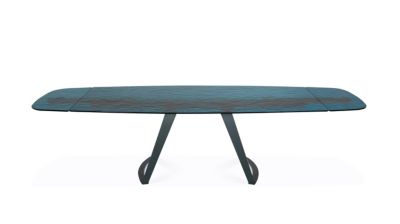The round base gives center stage to the impressive annealed glass top: with its textured bottom and shimmering surface in a clear, in either Bronze or Bleu color, it feels like dining on a piece of water.
