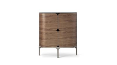 This China unit evokes the idea of metamorphosis. In beech and walnut veneer, it features two cylinders that pivot open to give access to the storage inside.