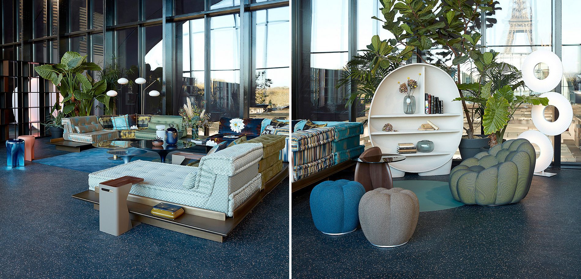 For this event, Roche Bobois furnished the “balcon Eiffel”, a 400m² VIP space with spectacular views of the Champ de Mars and the Eiffel Tower. The scenography highlighted several emblematic pieces of the brand, such as the Primordial bookcase, the Aqua table and the Bubble sofa. We could not have imagined a more exceptional place to end the series of events dedicated to the 50 Years of the Mah Jong. The new Mah Jong compositions dressed in fabrics by Kenzo Takada and Jean Paul Gaultier allowed numerous visitors to comfortably enjoy the panoramic view.
