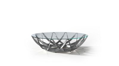 Simple and ingenious: the base of this collection is made of 12 identical aluminum slats that interlock and reinforce each other. A wide variety of colors and finishes are available, paired with clear or tinted glass tops.