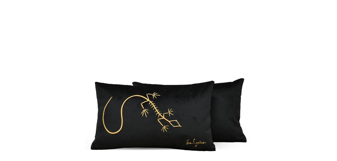 Rectangular cushion with 'LE LEZARD' artwork embroidered with gold thread on plain velvet. Designed by Jean Cocteau.