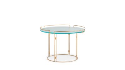 This collection features an elegant steel wire structure with a chrome-plated, black chrome-plated or matte gold finish. The tray is available in marble or antique bubble glass with a transparent or colored finish, a material resembling simmering wat...