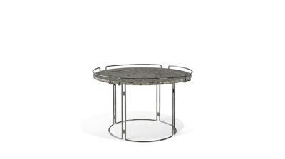 This collection features an elegant steel wire structure with a chrome-plated, black chrome-plated or matte gold finish. The tray is available in marble or antique bubble glass with a transparent or colored finish, a material resembling simmering wat...