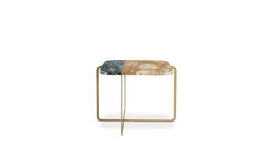 Dolomie's crossed frame (in black or brass) divides the tops into quarters, making it possible to alternate two marble choices.