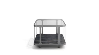 This collection of cocktail tables and end tables features a metal structure and square top with rounded corners. The transparent top exposes the lower tray which is coated with marble-like ceramic or a bubble glass black lacquer that resembles a liq...