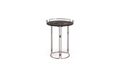 Una colección caracterizada por una elegante estructura en varilla de acero que disponible en acabado cromo, cromo negro u oro mate. Sostiene sobres de mármol o en vidrio antiguo con burbuja, transparente o de color, un material hirviente como las pr...