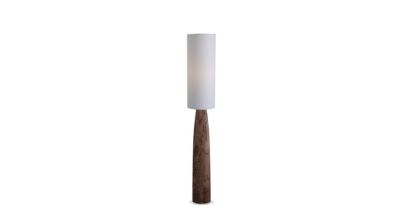 La base en frêne massif de ces luminaires, à l'irrégularité assumée, évoque un galet ou un rondin flotté. L'abat-jour en coton semble flotter juste au-dessus.