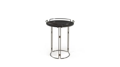 Una colección caracterizada por una elegante estructura en varilla de acero que disponible en acabado cromo, cromo negro u oro mate. Sostiene sobres de mármol o en vidrio antiguo con burbuja, transparente o de color, un material hirviente como las pr...