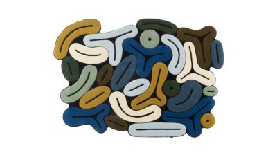 Le tapis tufté Tutti Frutti reprend certains codes des œuvres de l’artiste Joana Vasconcelos : des formes organiques, colorées et gourmandes qui génèrent une forme originale sont mises en relief par une variation d’épaisseurs sur un fond noir.