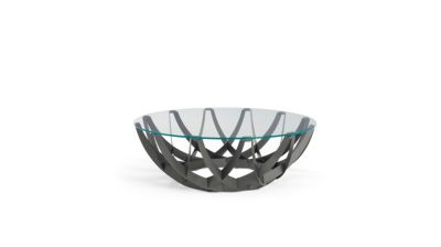 Simple et ingénieux : le piétement de cette collection est fait de 12 lames en aluminium identiques qui s'encastrent les unes dans les autres et se rigidifient mutuellement. Une grande variété de couleurs et de finitions accompagne des plateaux en ve...