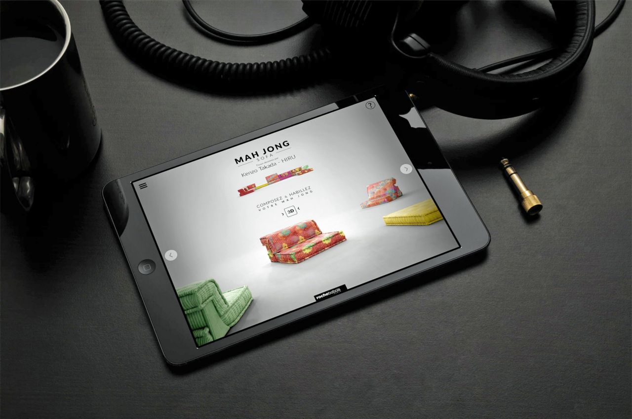 Une application très intuitive avec laquelle il est possible de composer simplement et en temps réel un canapé Mah Jong en choisissant et juxtaposant les coussins, puis de personnaliser chaque élément avec les collections de tissus imaginés par Jean Paul Gaultier, Kenzo Takada et Missoni Home.