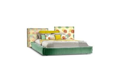 On retrouve dans ce lit les principes du canapé Mah Jong, icône des collections Roche Bobois : dans la même philosophie du vivre au ras du sol, il joue la juxtaposition de coussins pour la tête de lit, et son cadre ressemble aussi à un immense coussi...