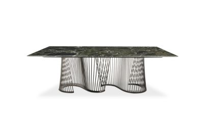 Les œuvres en acier de l'artiste Richard Serra ont inspiré au designer cette table au piétement ondulant, composé de 96 tiges de métal déployées en éventail ; une prouesse technique insoupçonnée qui donne une belle légèreté à l'ensemble. Le plateau e...