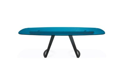Le piétement rond laisse la vedette à l’étonnant plateau de verre recuit : avec sa matière texturée en profondeur et irisé en surface, incolore, bronze ou bleu, c’est une pièce d’eau sur laquelle on est invité à dîner.