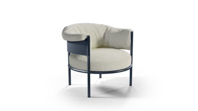 Le fauteuil Lunae combine formes rondes et matériaux contrastés.