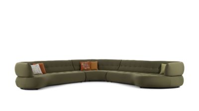 Une ligne de canapés enveloppants au format atypique. La courbe qu'ils dessinent permet de ménager différentes profondeurs d'assises. Aux extrémités, le dossier crée une alcôve pour se blottir ou, au contraire, s'allonger de tout son long.