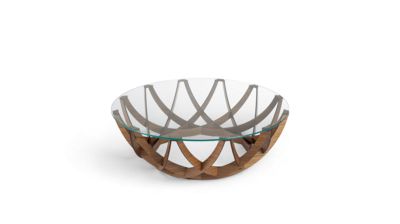 Semplice e geniale: la base di questa collezione, concepita partendo da dodici doghe intrecciate che si intersecano a metà del legno, rivela la maestria dell'ebanisteria moderna. Per accompagnarla, il piano è disponibile in vetro trasparente o colora...