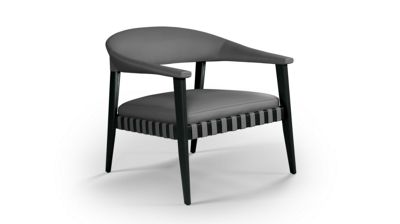 La poltrona Giorgia unisce legno e pelle intrecciata per un raffinato ritmo grafico.