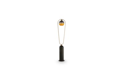 Luna è una lampada scultura con il suo paralume dal delicato colore degradé che sembra racchiuso in un arco protettivo in metallo.